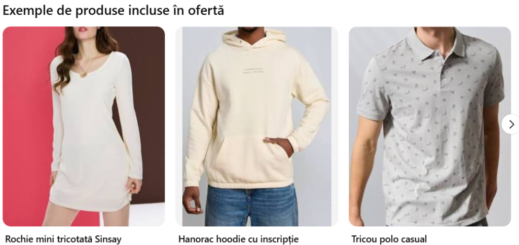 Sinsay este un magazin online accesibil și modern, disponibil pe site-ul oficial https://www.sinsay.com/ro/ro, unde găsești haine, accesorii și produse pentru casă la prețuri foarte bune. Brandul oferă o gamă variată pentru întreaga familie, de la îmbrăcăminte casual până la articole pentru locuință . Cu un cod reducere Sinsay și promoția activă de -27% la al doilea produs, poți beneficia de reduceri și discounturi suplimentare. Adaugă cel puțin două produse în coș și folosește un cupon reducere Sinsay pentru a activa voucher discount. Oferta este valabilă pentru produse selectate, în limita stocului disponibil.